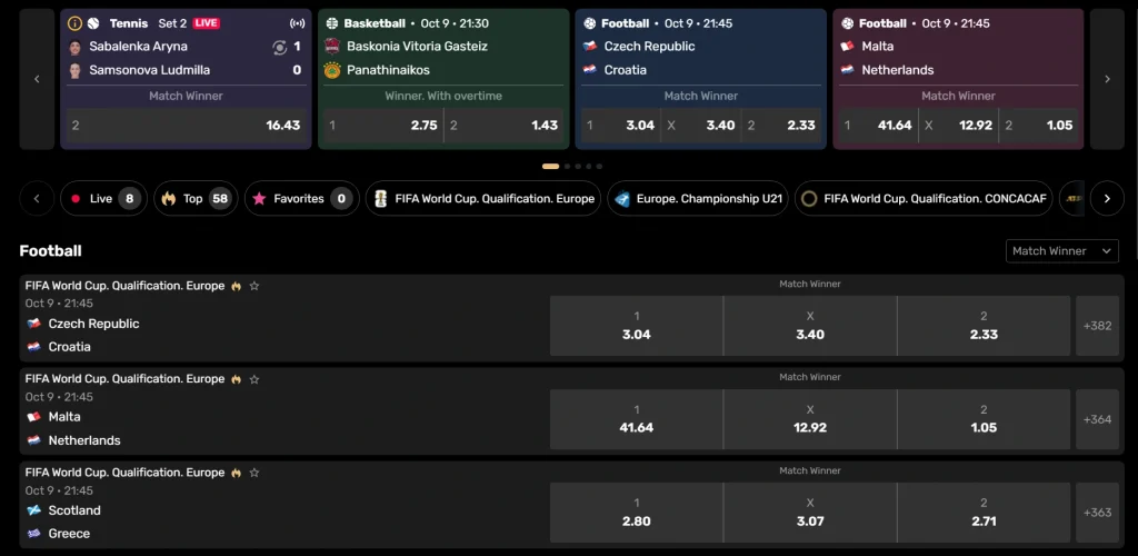 - Integrated Live Analytics: Our live betting interface is a dynamic dashboard. Instead of relying on external tabs or apps, all essential match statistics, momentum indicators, and detailed historical analytics are streamed directly alongside the odds, making split-second decisions accurate and fast.